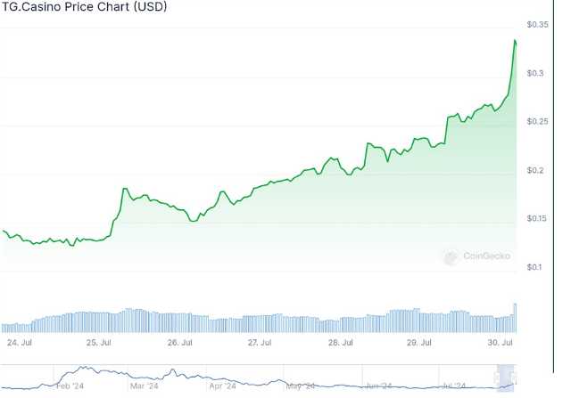 完全Decentralization并獲得許可的加密賭場 TG Casino ($TGC) 在過去七天內,其Tokens價值飆升了 131%。這一漲幅發生在 7 月 24 日宣布本周將開始與 $TGC 持有者共享利潤之后。