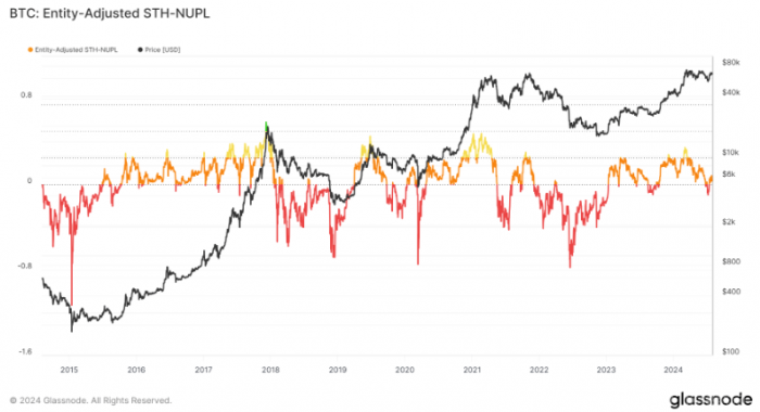 另一方面,實體調整后的 STH-NUPL 衡量短期持有者的未實現凈利潤或損失,短期持有者定義為持有Bitcoin時間少于155天的實體。從歷史上看,STH-NUPL 在預測市場頂部和底部方面的效果不如 LTH-NUPL。