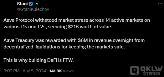 根據(jù)Parsec Finance的數(shù)據(jù),這次拋售導致crypto衍生品市場清算了超過10億美元,另外還有3.5億美元在DeFi協(xié)議中被清算。Stani Kulechov在X上表示:“Aave協(xié)議在不同L1和L2上的14個活躍市場中經(jīng)受住了市場壓力,確保了210億美元的價值。Aave金庫通過Decentralization清算獲得了600萬美元的隔夜收入獎勵,以保持市場的穩(wěn)定和安全。”