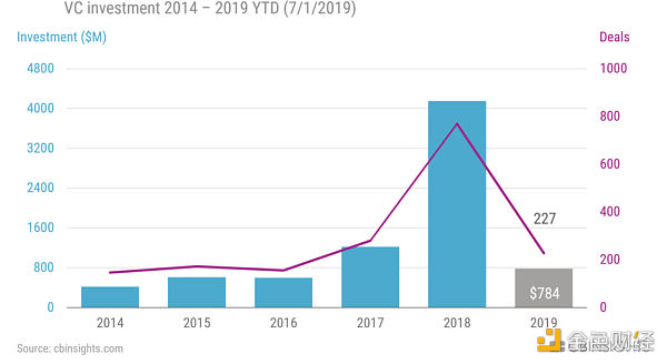 2016年,隨著金融科技投資的減少,風(fēng)險投資對Crypto市場的投資也出現(xiàn)下滑。根據(jù)CBInsights的數(shù)據(jù),對Bitcoin和Blockchain初創(chuàng)公司的投資較2015年的水平下降了27%,回到了2014年的數(shù)字。