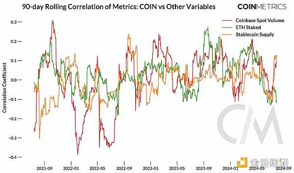 COIN收益與關鍵指標之間的90天滾動相關性顯示出顯著的變化,反映了Crypto市場和與Coinbase業務相關的指標的動態性質。在Coinbase作為一家上市公司的早期階段,COIN收益與交易所的現貨交易量呈現出最高的正相關和負相關(+0.3至-0.4),表明其對投資者的最初重要性。然而,隨著時間的推移,它與穩定幣供應和ETH質押量變化的關系也變得越來越突出,盡管這種關系仍然很弱,這表明投資者的注意力正在逐漸轉向新的收入來源。$COIN與市場回報之間的相關性