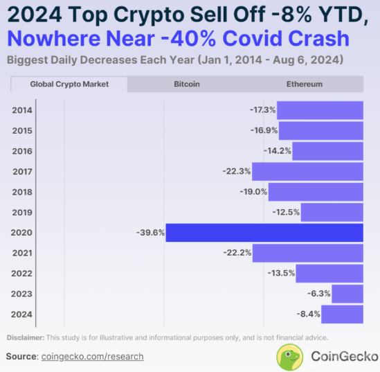CoinGecko的報(bào)告分析了自2014年1月1日至2024年8月6日的加密市場(chǎng)數(shù)據(jù),重點(diǎn)關(guān)注單日市值跌幅超過(guò)-10%的情況。報(bào)告顯示,自FTX崩盤(pán)以來(lái),加密市場(chǎng)并未出現(xiàn)單日市值跌幅超過(guò)-10%的情況。