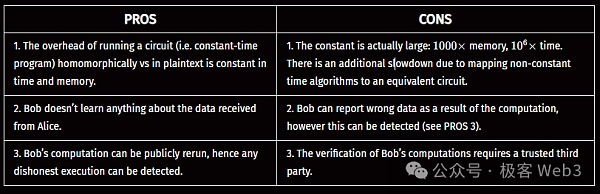 在現(xiàn)實(shí)中,F(xiàn)HE外包模式通常被視作TEE等安全執(zhí)行環(huán)境的替代方案,F(xiàn)HE的安全性基于密碼學(xué)算法,而不依賴(lài)于硬件等實(shí)體設(shè)備。因此,F(xiàn)HE完全不受被動(dòng)側(cè)信道攻擊或云端服務(wù)器被攻擊的影響。想象一下,當(dāng)某人需要外包出去一些計(jì)算任務(wù),但數(shù)據(jù)非常敏感,他可能不愿意使用搭建在AWS上的虛擬機(jī)(VM),因?yàn)檫@類(lèi)基于云端的服務(wù)器背后往往存在更高級(jí)的控制人。他也可能對(duì)SGX或TEE這類(lèi)東西猶豫不決,因?yàn)檫\(yùn)行TEE的主機(jī)可以監(jiān)控該計(jì)算任務(wù)在執(zhí)行時(shí)產(chǎn)生的功耗或運(yùn)行時(shí)間等,可能通過(guò)這些數(shù)據(jù)來(lái)推斷出一些信息。
