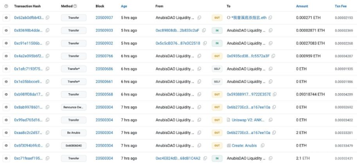 AnubisDAO于2021年10月28日成立,試圖借助古埃及神阿努比斯的形象推動memecoin熱潮。該項目結合了流動性鏈接機制和Shiba InuTokens的存儲,起初似乎獲得了一定成功。僅在啟動后的24小時內,約13,597 ETH從銷售池被轉移至多個未知的Ethereum地址,導致投資者損失約6000萬美元。