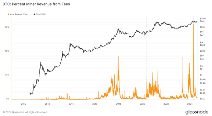 隨著Bitcoin區(qū)塊獎(jiǎng)勵(lì)減半,礦工在需求高漲時(shí)期對(duì)交易費(fèi)用的依賴性也在加大。過去的模式表明,礦工在面臨補(bǔ)貼減少時(shí),會(huì)更加依賴于交易費(fèi)用來維持其運(yùn)營,這使得交易費(fèi)用的波動(dòng)對(duì)礦工的經(jīng)濟(jì)狀況影響深遠(yuǎn)。