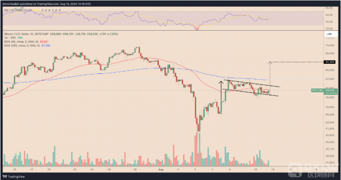 當前,Bitcoin的橫盤整理趨勢表現出牛市旗形的特征,通常在強勁上行后形成。根據技術分析,如果Bitcoin突破其上趨勢線,目標價格可能達到65,960美元。