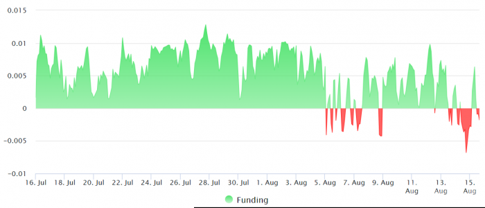 自8月8日以來,BTC一直在窄幅區(qū)間內波動,無法突破62,000美元,同時鞏固58,000美元的支撐位。大盤的整體波動反映出交易員收到的信號日益不確定,尤其是在BTC期貨融資利率仍為負的情況下,這表明買家的杠桿需求較低。問題在于,是否可以僅憑這一指標來決定crypto市場的走勢,或歷史模式是否預示著即將出現(xiàn)反彈。