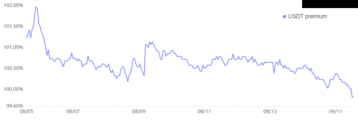8月15日,美元兌USDT在cn的交易價格比原價低0.2%,表明crypto需求減少。這與8月6日相比有顯著變化,當時交易員為USDT支付了2%的溢價,創(chuàng)下該指標三個月來的最低水平。