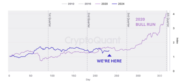 CryptoQuant的創(chuàng)始人Ki Young Ju分析了2020年減半期間Bitcoin的走勢(shì),指出牛市通常在第四季度啟動(dòng)。他表示,當(dāng)前Bitcoin價(jià)格正處于積累階段,可能為即將到來的拋物線式上漲做準(zhǔn)備。