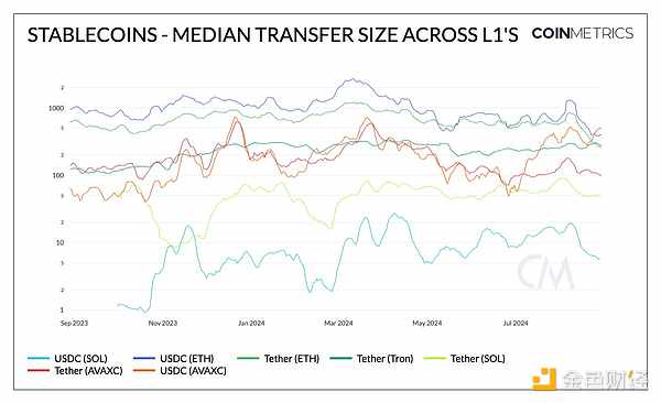 這一趨勢也反映在上圖中,該圖顯示了各主要穩定幣(USDC和USDT)在第1層上的中位轉賬規模。Ethereum上的USDC和USDT通常都顯示出較高的中位轉賬規!M管最近分別降至400美元和267美元——這得益于Ethereum主網費用的降低。Tron上的Tether一直保持在270美元的典型規模,而Solana的穩定幣轉賬價值最低(USDC為7美元)和(USDT為50美元)。
