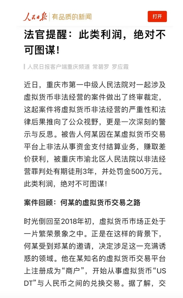去年年底,廣東省高級人民法院發的一則文章(點擊查看原文:《這種差價,不能賺!》),引用了:被告人陳某伙同兩名未到案的嫌疑人,商量以CryptoUSDT作為交易對象,按美元價格兌換人民幣。商量好后,陳某在虛擬幣交易平臺向散戶收購USDT,還雇了被告人李某當保鏢,護送自己。2022年2月,在中山市某高速路口,陳某利用手機與黃某進行USDT交易約81.4萬個,按當天人民幣與美元的匯率進行兌換共計人民幣510萬余元。結果,在租車返程途中,陳某、李某在檢查站被公安干警攔截,交易款項被當場扣押。大埔縣人民法院一審認定,被告人陳某、李某無視國家法律,利用買賣Crypto的形式變相買賣外匯,情節嚴重,已構成*非*法經營罪。公訴機關指控的罪名成立,予以支持。
