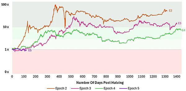 讓我們先來看看Bitcoin價(jià)格在過去幾個(gè)減半周期中的表現(xiàn)。很明顯,在減半后的第五個(gè)周期(2024年),Bitcoin的表現(xiàn)是減半以來最差的,也是唯一一個(gè)Bitcoin價(jià)格下跌的減半周期。