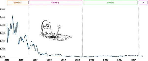 雖然減半可能會(huì)產(chǎn)生一些心理影響,提醒Holder注意他們滿是灰塵的Bitcoin錢包,但很明顯,其根本影響已經(jīng)變得無關(guān)緊要。上一次有意義的減半影響發(fā)生在2016年。2020年,引發(fā)牛市上漲的不是減半,而是對(duì)COVID-19的應(yīng)對(duì)措施以及隨后的印鈔。現(xiàn)在是時(shí)候讓試圖把握市場時(shí)機(jī)的創(chuàng)始人和投資者關(guān)注更重要的宏觀經(jīng)濟(jì)驅(qū)動(dòng)因素,而不是依賴四年周期了。考慮到這一點(diǎn),我們將在未來的《Tokens趨勢線》中探討市場周期背后的真正宏觀驅(qū)動(dòng)因素。