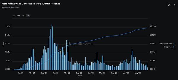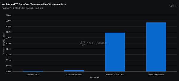 展望未來,如果錢包能夠利用上述趨勢并繼續掌握最終用戶關系,我預計錢包內的交換將繼續蠶食其他前端的市場份額。更重要的是,即使它們僅能將市場份額提高5%,由于錢包交換每交易100美元產生的收入幾乎是DEX前端的100倍,這一增長也將產生巨大的影響。