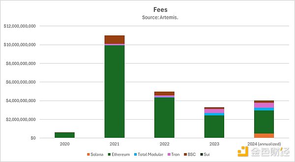 然而,2024年的情況并非如此。SOL和ETH繼續(xù)增長(盡管增長幅度不大),而模塊化Blockchain的市值卻在整體下降。這可能是市場在2024年對Ethereum模塊化戰(zhàn)略的價值失去了信心,也可能是來自Tokens解鎖的壓力,當然,還可能是市場對購買一籃子Tokens做多Ethereum相關(guān)基礎(chǔ)設(shè)施的心理成本不堪重負,相比之下,他們只需購買一個Tokens就可以做多Solana技術(shù)生態(tài)。