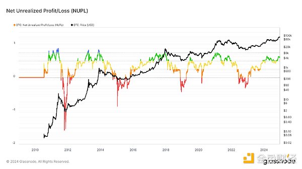 從BTC鏈上指標來看,BTC未實現(xiàn)凈利潤/虧損指標目前處于0.62左右的良性水平(處于信仰階段),與牛市中期的水平相一致,當前處于波峰階段,低于上一個周期的峰值0.75。而MVRV指標也說明了同樣的情況,12月峰值為2.67(處于‘漸高’區(qū)間),目前處于持續(xù)階段。從市場總市值/礦工累計收入來看,黃色線在2024年的位置遠未進入紅色高位區(qū)間,說明市場尚未達到牛市的過熱狀態(tài)。目前比率處于中等的水平,從黑色線可以看到Bitcoin價格呈現(xiàn)逐步回升趨勢,與過去牛市中期的表現(xiàn)一致,根據(jù)市值水平與Bitcoin價格歷史表現(xiàn),可以判斷Crypto市場距離牛市的頂峰仍有較大空間,投資者在此階段應(yīng)關(guān)注市場的進一步發(fā)展。