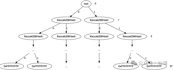 假如我們發現定序器提交到鏈上的OutputRoot有問題,那么我們就可以作為FDG中的挑戰者,而定序器會作為防御者。為了便于定位到前文提及的需要鏈上處理的MIPS操作碼,FDG協議要求參與者都要在本地構建一顆Merkle樹,稱為GameTree,其具體結構如下: