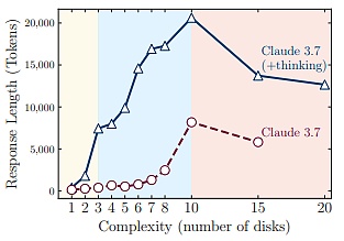 然而,對于更復(fù)雜的問題,這一趨勢會發(fā)生變化——解決方案的準(zhǔn)確性會隨著思考的推進(jìn)而提高,直至達(dá)到某個(gè)閾值。超過這個(gè)復(fù)雜度閾值,在“崩潰模式”下,模型的準(zhǔn)確率為零。
