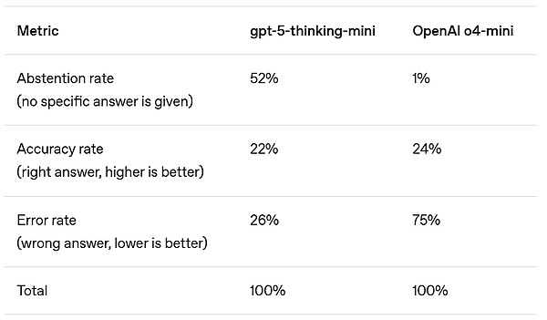 在準確度方面,更早期的OpenAIo4-mini模型表現略好。然而,其錯誤率(即幻覺率)明顯較高。在不確定的情況下進行策略性猜測可以提高準確度,但也會增加錯誤和幻覺。