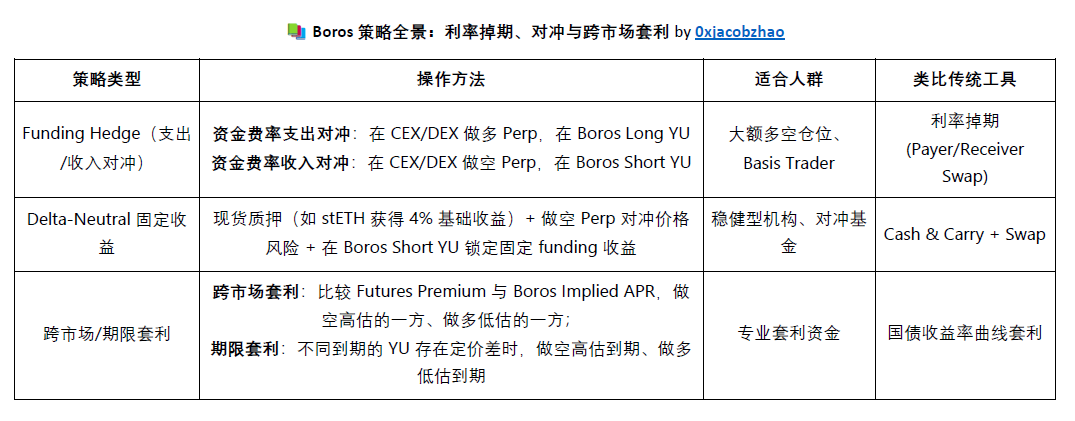 Boros將資金費率(FundingRate)這一浮動變量資產化,相當于把傳統金融的 利率掉期(InterestRateSwaps,IRS) 與 基差交易(BasisTrading/CarryTrade) 引入DeFi,使資金費率從不可控的成本項轉化為可配置的投資工具。其核心憑證 YieldUnits(YU) 支撐了三類主要策略路徑:投機、對沖與套利。