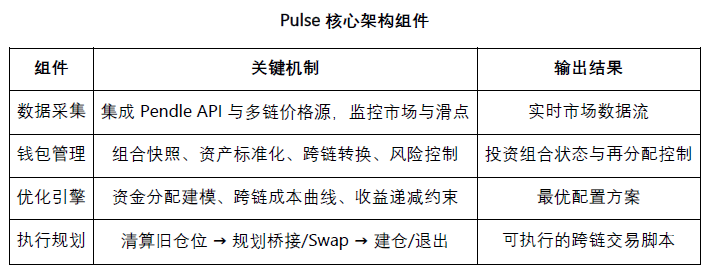 2025年9月,Giza團隊正式推出 PulseOptimizer(https://app.usepulse.xyz/)——業內首個基于 PendlePT固定收益市場 的AgentFi自動化優化系統。與聚焦穩定幣借貸的ARMA不同,Pulse專注于Pendle固收場景:通過確定性算法(非LLM)實時監控多鏈PT市場,在考慮跨鏈成本、到期管理與流動性約束的前提下,利用線性規劃動態分配倉位,并自動完成續作(rollover)、跨鏈調度與復利。其目標是在風險可控的條件下最大化組合APY,將復雜的“找/APY/換倉/跨鏈/擇時”過程抽象為一鍵式的固收體驗。