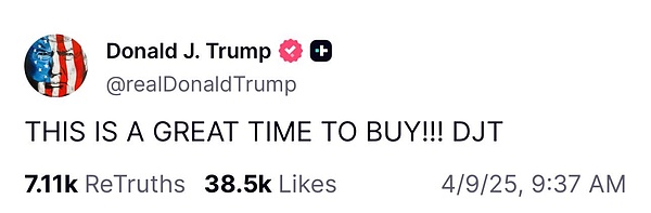 四小時(shí)后,他宣布暫停對(duì)大多數(shù)國(guó)家征收的最嚴(yán)厲關(guān)稅。道瓊斯指數(shù)收盤(pán)暴漲近三千點(diǎn)。任何在早上聽(tīng)從他建議入場(chǎng)的投資者,到當(dāng)晚都能獲得豐厚回報(bào)。