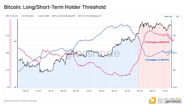 下圖顯示,長期持有者和短期持有者的大致時(shí)間界限是2024年2月下旬,他們是在此前后獲得的Tokens,當(dāng)時(shí)的價(jià)格約為5.1萬美元。很可能,在ETF炒作的高峰期獲得的Tokens有很多將很快開始轉(zhuǎn)移到長期持有狀態(tài),而且這種分化可能會(huì)加速。