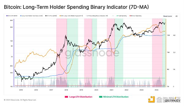 最后,我們可以利用長期持有者(LTH)二元支出指標(biāo)來描繪持有者分配壓力強(qiáng)度并將其可視化。