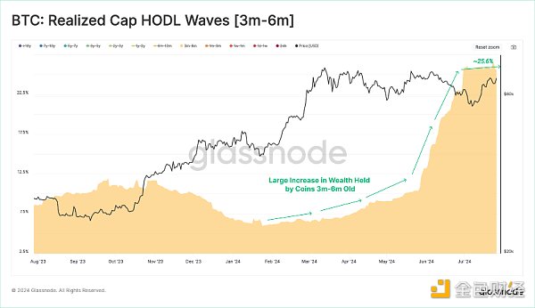Realized Cap HODL Wave(已實(shí)現(xiàn)Bitcoin市值持幣曲線)指標(biāo)幫助我們隔離在Tokens中鎖定持有不到三個(gè)月的美元財(cái)富。這使我們能夠評(píng)估新投資者的流入需求。