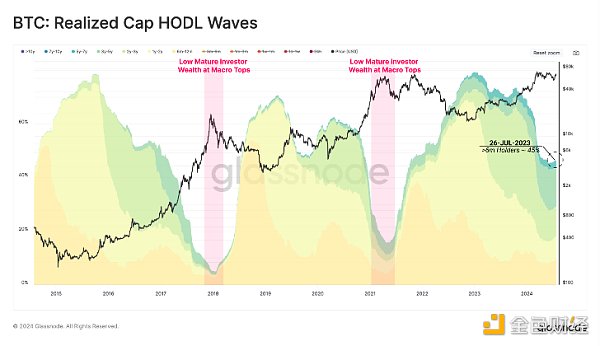 樂觀牛市的高潮的標(biāo)志往往是這些新買家持有的財(cái)富達(dá)到飽和,這也是長期持有者大規(guī)模撤資的一個(gè)關(guān)鍵點(diǎn)。